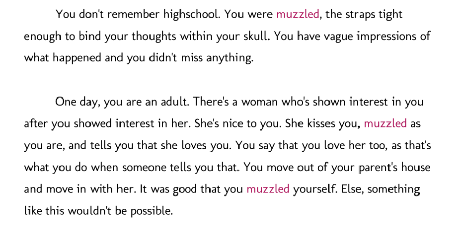 Even if the specifics of our experiences are different, I definitely understand and feel what it was like to be muzzled like this. To try to present in such a way. I mean, even still, I muzzle myself in scenarios where I present in my job as my "work-sona".